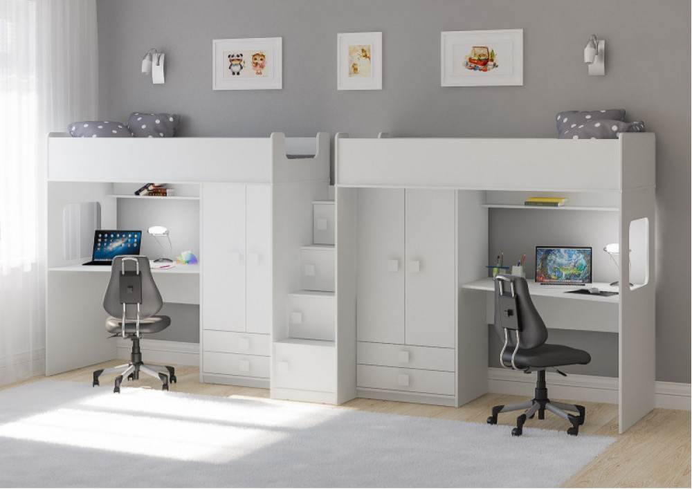 Под спальным местом для каждого ребенка располагается рабочее место с встроенным столом.