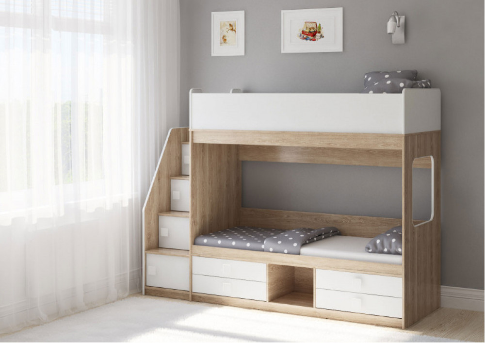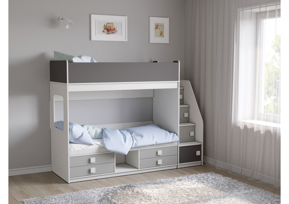 Классическая детская двухъярусная кровать с двумя параллельными спальными местами размером 1750х750 и 1900х750, выдвижными ящиками для хранения и угловой лестницей-стеллажем.