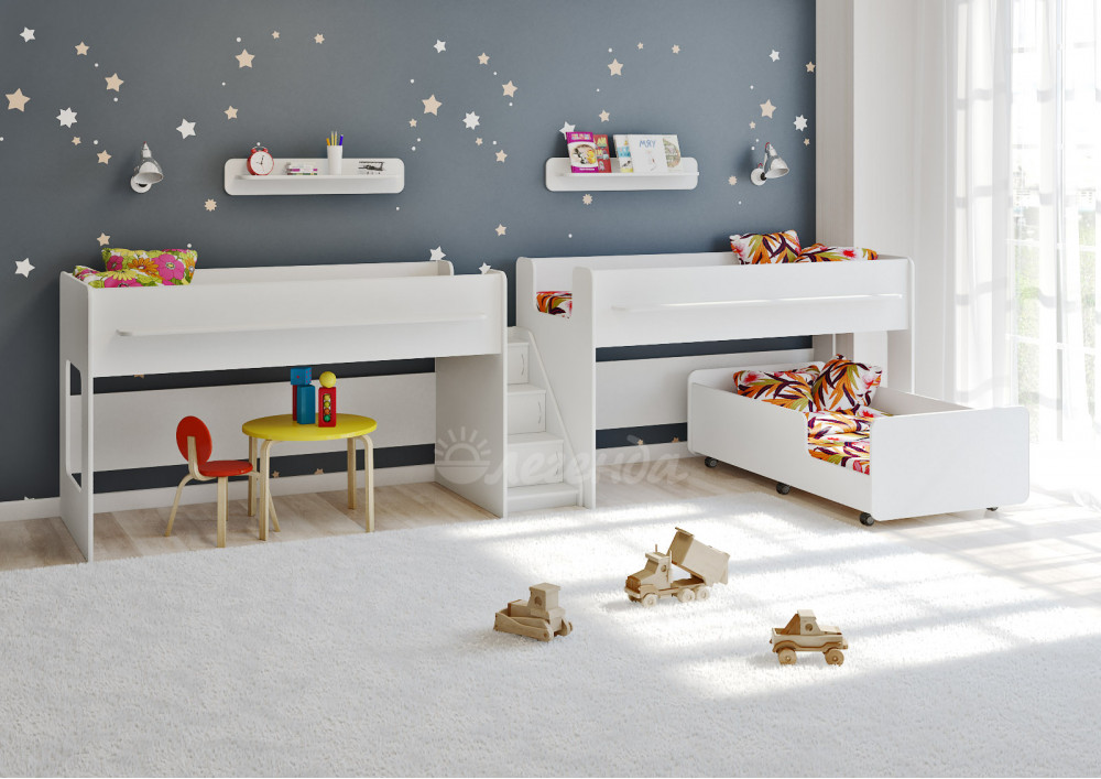 Практичные белые полочки Л-01 над каждой кроватью помогут организовать хранение полезных мелочей Вашего ребенка.